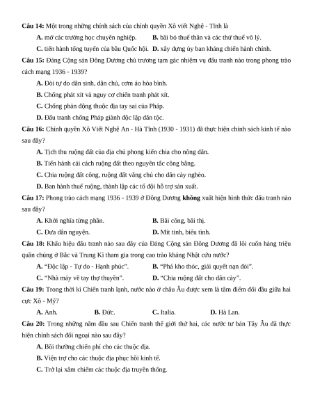 Câu 14: Một trong những chính sách của chính quyền Xô viết Nghệ - Tĩnh là