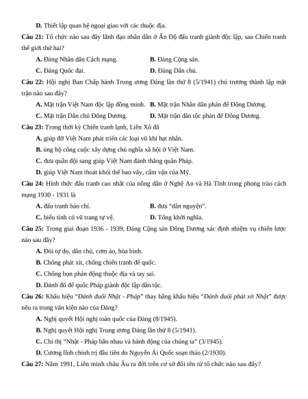 Câu 25: Trong giai đoạn 1936 - 1939, Đảng Cộng sản Đông Dương xác định nhiệm vụ chiến lược nào sau đây?