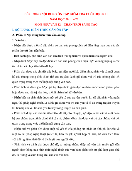 Đề cương ôn tập Cuối kì 1 Ngữ văn 12 Chân trời sáng tạo