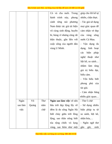 cuộc sống của người dân - Vận dụng đa vùng U Minh. dạng, linh hoạt các biện pháp nghệ thuật như liệt kê, so sánh… nhằm làm tăng giá trị biểu đạt, biểu cảm. - Vốn hiểu biết phong phú của tác giả. - Cảm nhận bằng nhiều giác quan… Ngàn Võ Thơ