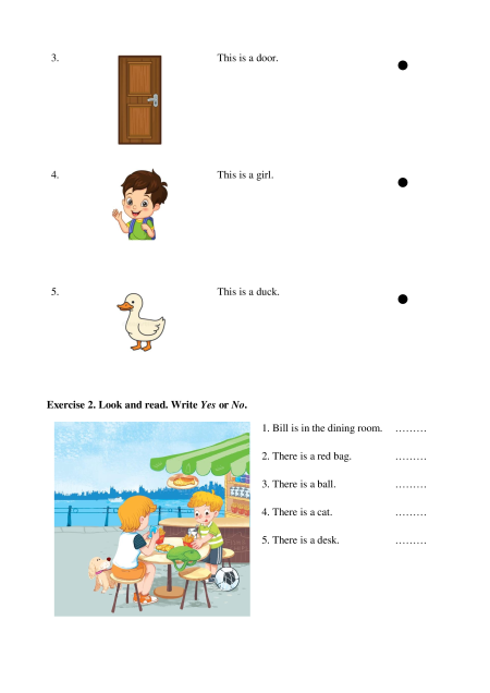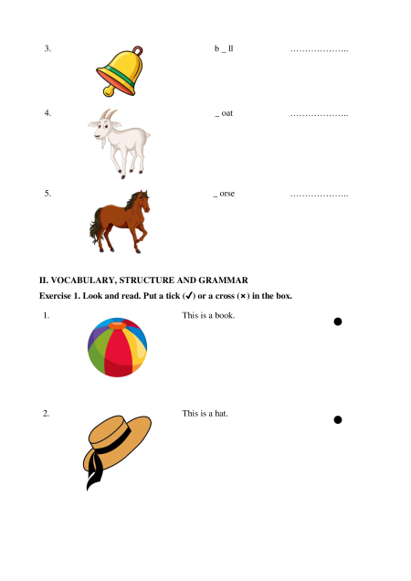 Exercise 1. Look and read. Put a tick (✔) or a cross (⨯) in the box. 1. This is a book. ● 2. This is a hat. ● 3. This is a door. ● 4. This is a girl. ● 5. This is a duck. ●