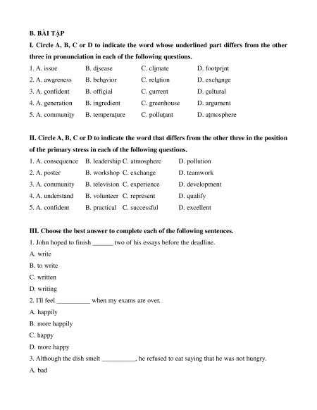 three in pronunciation in each of the following questions. 1. A. issue B. disease C. climate D. footprint 2. A. awareness B. behavior C. relation D. exchange 3. A. confident B. official C. current D. cultural 4. A. generation B. ingredient C. greenhouse D. argument 5. A. community B. temperature C. pollutant D. atmosphere