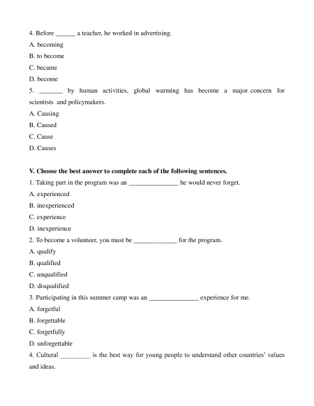 1. A. consequence B. leadership C. atmosphere D. pollution 2. A. poster B. workshop C. exchange D. teamwork 3. A. community B. television C. experience D. development 4. A. understand B. volunteer C. represent D. qualify 5. A. confident B. practical C. successful D. excellent