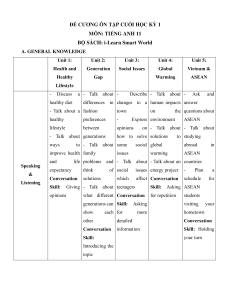 BỘ SÁCH: i-Learn Smart World A. GENERAL KNOWLEDGE Unit 1: Unit 2: Unit 3: Unit 4: Unit 5: Health and Generation Social Issues Global Vietnam & Healthy Gap Warming ASEAN Lifestyle - Discuss a - Talk about - Describe - Talk about - Ask and healthy diet