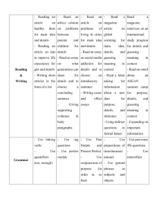 Conversation information Skill: Holding Skill: your turn Introducing the topic - Reading an - Read an - Read an - Read a Read a article on advice column article on magazine magazine healthy diets on problems problems of article on interview on an for main idea between living in cities global international and details parents and for main idea warming for study program - Reading an children for and details main idea, for details and article on tips details - Read an essay details, and guessing