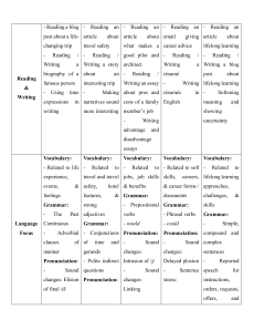 - Reading / - Reading / good pilot and - Reading / - Reading / Writing a Writing a story architect Writing a Writing a blog biography of a about an - Reading / résumé post about Reading famous person interesting trip Writing an essay - Writing lifelong learning & - Using time -