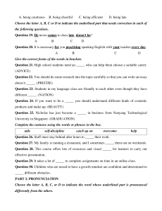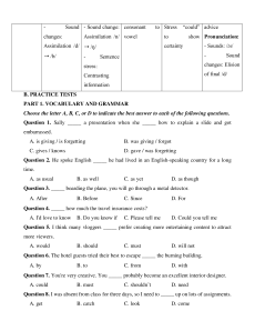Sound - Sound change: consonant to Stress “could” advice changes: Assimilation /n/ vowel to show Pronunciation: Assimilation /d/ ➝ /ŋ/ certainty - Sounds: /ɔɪ/ ➝ /b/ - Sentence - Sound stress: changes: Elision Contrasting of final /d/ information B. PRACTICE TESTS