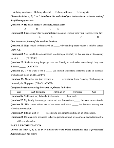 Question 13. School uniform is compulsory in most of Vietnamese schools. A. divided B. paid C. required D. depended