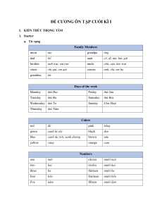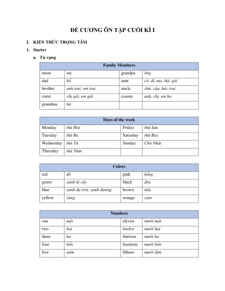 I. KIẾN THỨC TRỌNG TÂM 1. Starter a. Từ vựng Family Members mom mẹ grandpa ông dad bố aunt