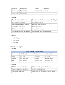 4. Unit 3: Would you like a bubble tea? a. Từ vựng Food fries khoai tây chiên juice nước ép hoa quả noodles mì, bún, phở mango xoài pizza pizza orange cam bubble tea trà sữa trân châu banana chuối chicken gà plum mận rice cơm, gạo apple táo water nước Numbers ten mười twenty-nine hai mươi chín twenty hai mươi thirty ba mươi twenty-one hai mươi mốt forty bốn mươi twenty-two hai mươi hai fifty năm mươi twenty-three hai mươi ba sixty sáu mươi twenty-four hai mươi tư seventy bảy mươi twenty-five hai mươi lăm eighty tám mươi