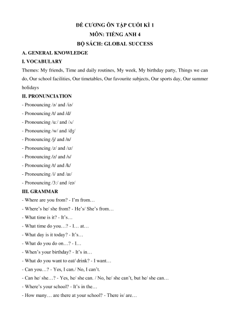 do, Our school facilities, Our timetables, Our favourite subjects, Our sports day, Our summer holidays II. PRONUNCIATION - Pronouncing /ə/ and /iə/ - Pronouncing /t/ and /d/ - Pronouncing /uː/ and /ʌ/ - Pronouncing /w/ and /dʒ/ - Pronouncing /j/ and /n/ - Pronouncing /z/ and /ɪz/ - Pronouncing /z/ and /s/ - Pronouncing /t/ and /k/ - Pronouncing /i/ and /aɪ/ - Pronouncing /3:/ and /eə/ III. GRAMMAR
