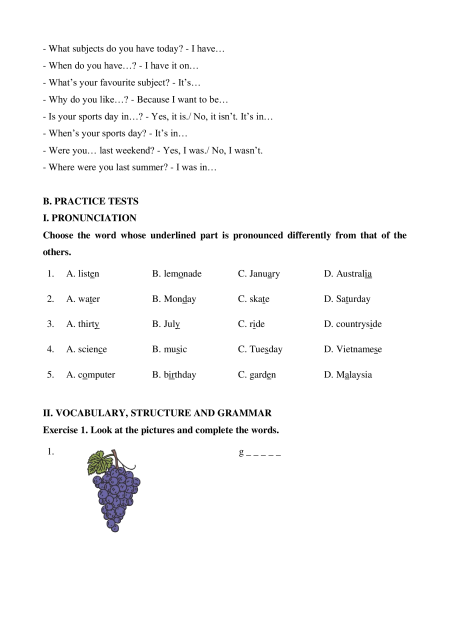 - Where were you last summer? - I was in… B. PRACTICE TESTS I. PRONUNCIATION