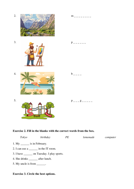 Exercise 2. Fill in the blanks with the correct words from the box. Tokyo birthday PE lemonade computer 1. My ______ is in February.