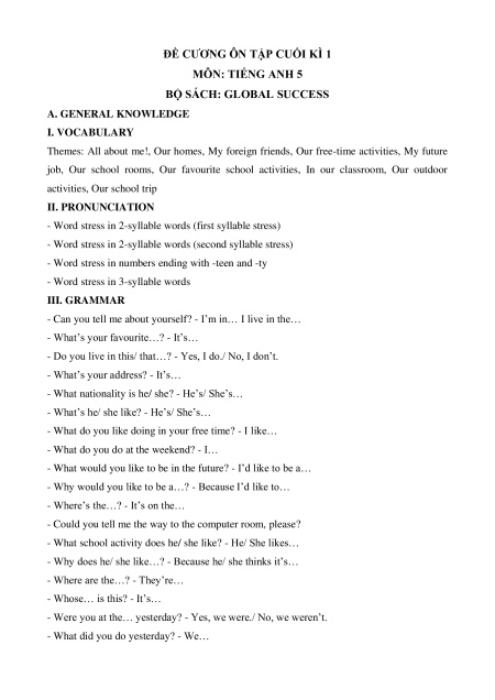 Đề cương ôn tập Cuối kì 1 Tiếng Anh 5 Global Success