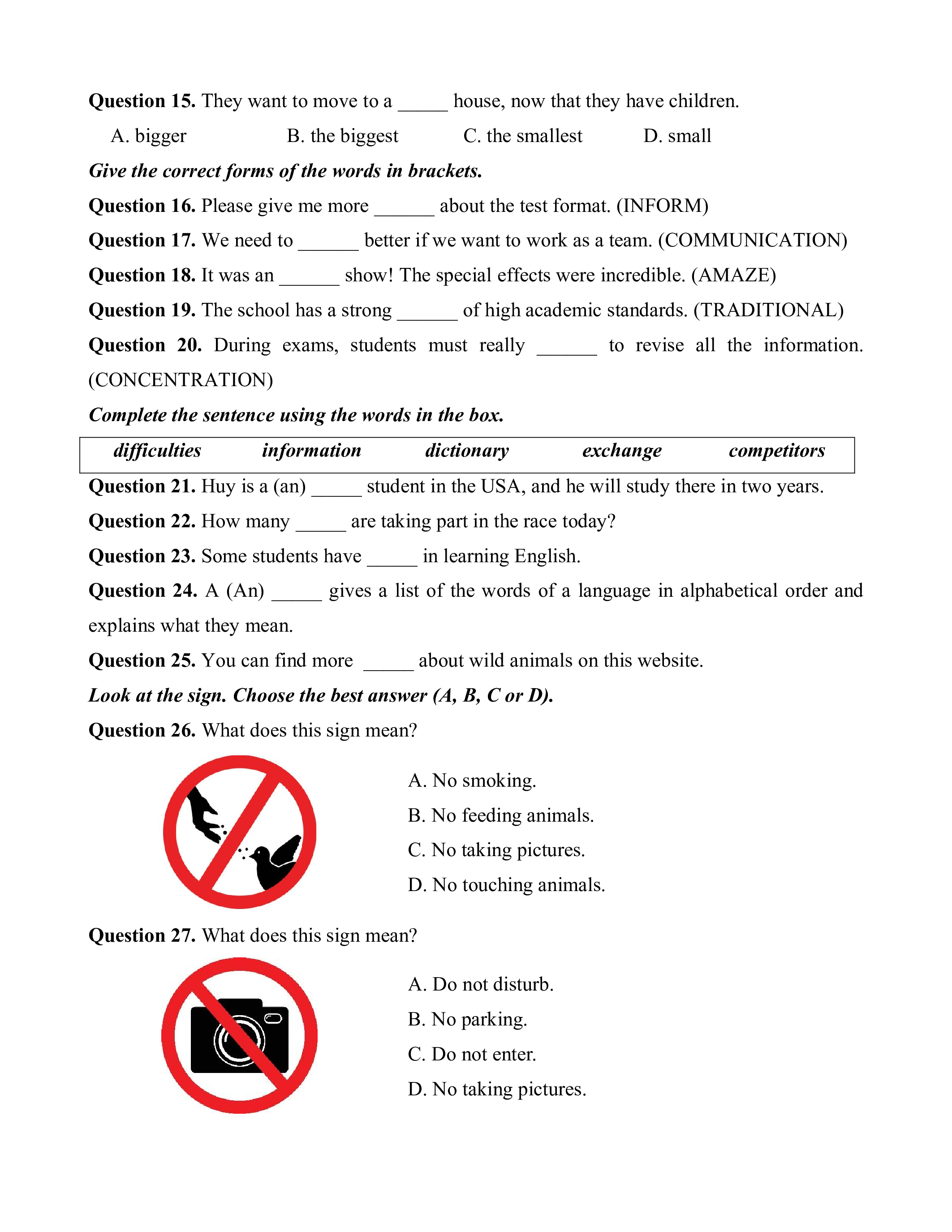 Question 15. They want to move to a _____ house, now that they have children. A. bigger B. the biggest C. the smallest D. small