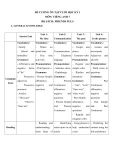 BỘ SÁCH: FRIENDS PLUS A. GENERAL KNOWLEDGE Unit 1: Unit 2: Unit 3: Unit 4: Starter Unit My time Communication The past In the picture Vocabulary: Vocabulary: Vocabulary: Vocabulary: Vocabulary: - Family - Where we -