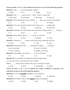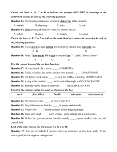 Question 1. Stay _____ your house during a typhoon. A. inside B. on C. outside D. up