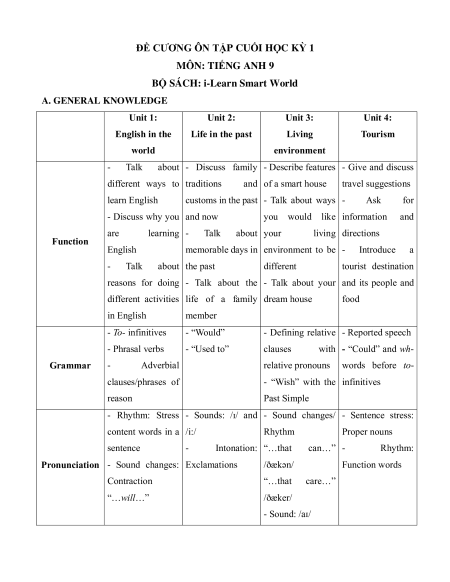 BỘ SÁCH: i-Learn Smart World A. GENERAL KNOWLEDGE Unit 1: Unit 2: Unit 3: Unit 4: English in the Life in the past Living Tourism world environment - Talk