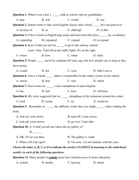 Question 1. When I was a kid, I _____ walk to school with my grandfather. A. may B. will C. would D. can