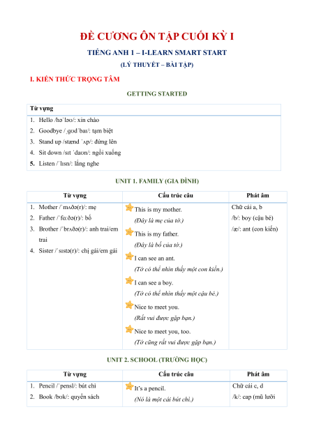 Đề cương ôn tập Cuối kì 1 Tiếng Anh lớp 1 iLearn Smart Start