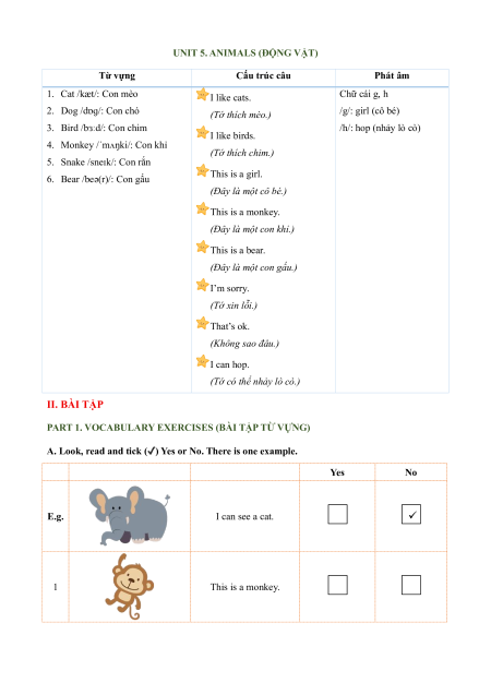 UNIT 5. ANIMALS (ĐỘNG VẬT) Từ vựng Cấu trúc câu Phát âm 1. Cat /kæt/: Con mèo I like cats. Chữ cái g, h 2. Dog /dɒɡ/: Con chó (Tớ thích mèo.) /g/: girl (cô bé) 3. Bird /bɜːd/: Con chim /h/: hop (nhảy lò cò) I like birds.