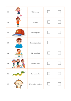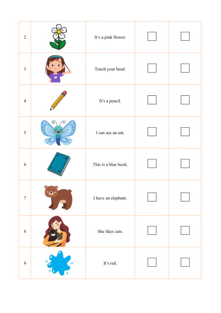 A. Look, read and tick (✔) Yes or No. There is one example. Yes No E.g. I can see a cat. 1 This is a monkey. 2 It’s a pink flower. 3 Touch your head. 4 It’s a pencil. 5 I can see an ant. 6 This is a blue book. 7 I have an elephant. 8 She likes cats. 9 It’s red.