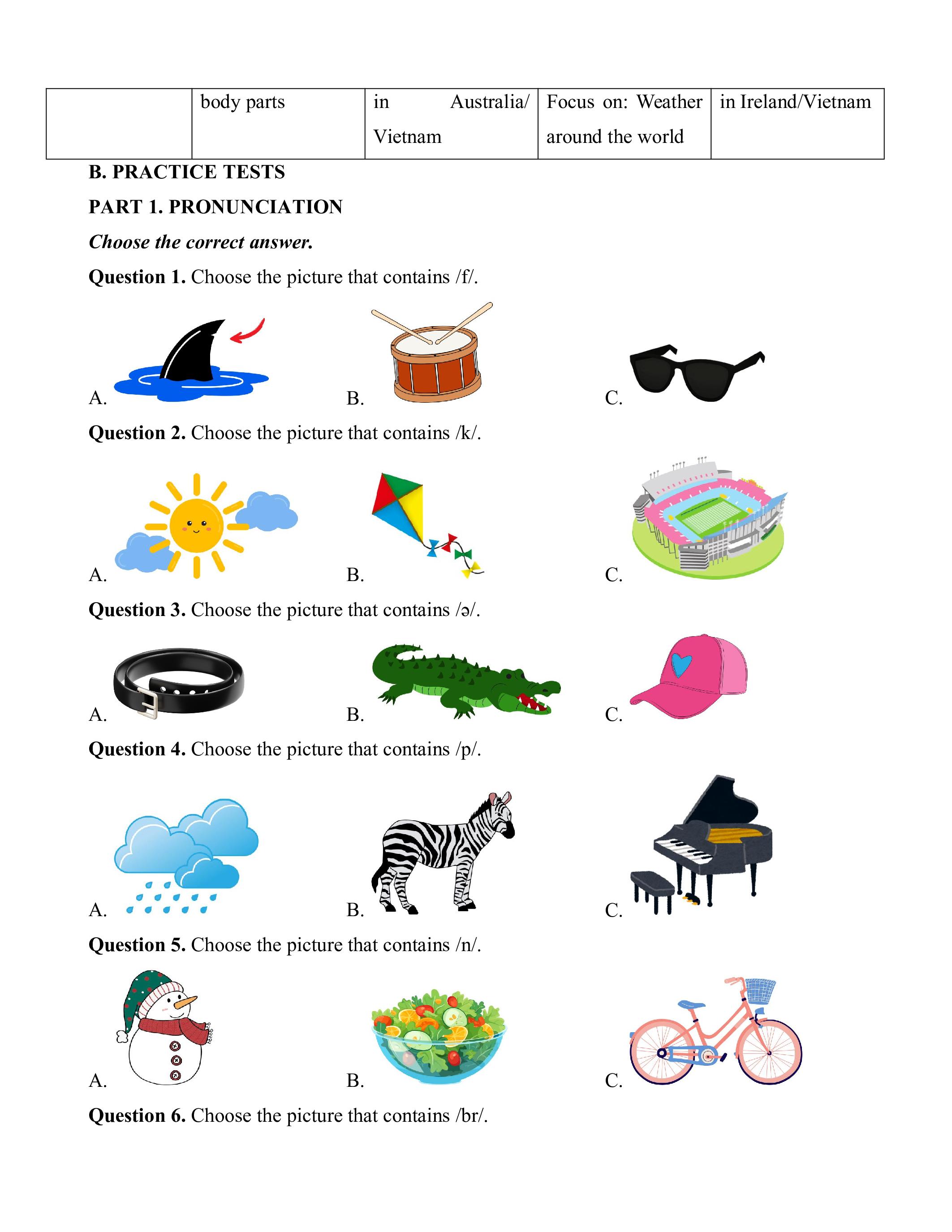 Australia/ Focus on: Weather in Ireland/Vietnam Vietnam around the world B. PRACTICE TESTS PART 1. PRONUNCIATION Choose the correct answer.