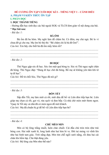 ĐỀ CƯƠNG ÔN TẬP CUỐI HỌC KÌ I – TIẾNG VIỆT 1 – CÁNH DIỀU