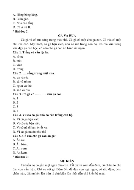 Câu 5. Cô rùa cho gà con ăn gì? A. Ăn rau. B. Ăn bánh. C. Ăn cơm. D. Ăn kem. * Bài đọc 3: MẸ KIẾN