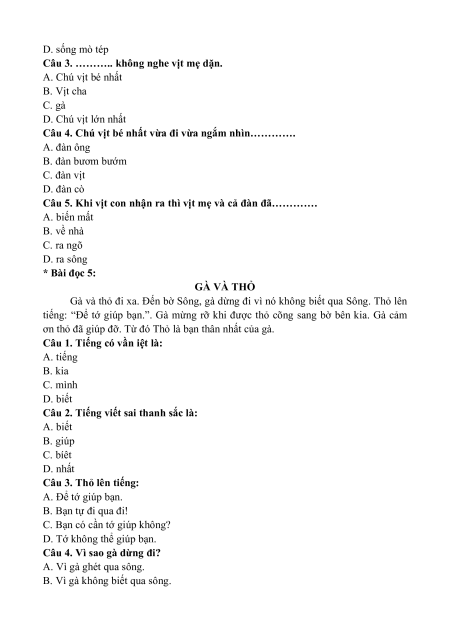 Câu 5. . . . . ., để đàn con ngủ ngon, cô sắp đệm. B. Đêm đến A. Sáng ra C. Trưa hè D. Mùa đông * Bài đọc 4: VỊT NHÉP LẠC MẸ