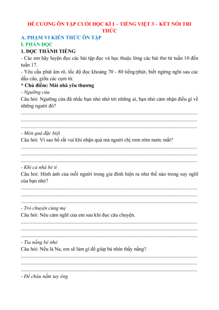 ĐỀ CƯƠNG ÔN TẬP CUỐI HỌC KÌ I – TIẾNG VIỆT 3 – KẾT NỐI TRI THỨC