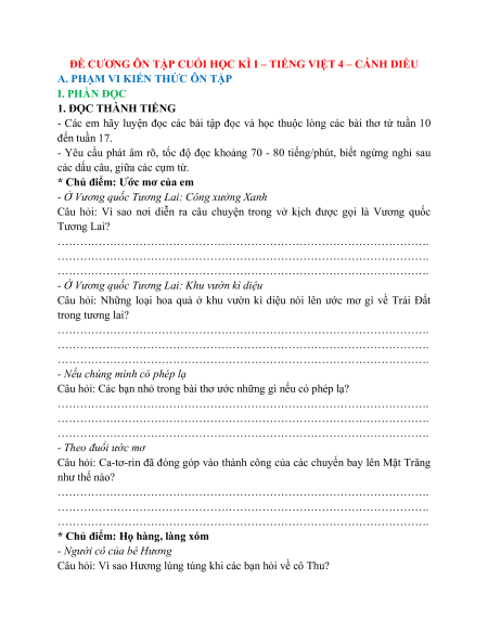 ĐỀ CƯƠNG ÔN TẬP CUỐI HỌC KÌ I – TIẾNG VIỆT 4 – CÁNH DIỀU
