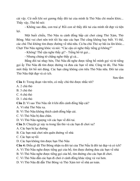 Câu 1: Trong đoạn văn trên, có mấy chú thỏ được nhắc tới? A. 2 chú thỏ B. 3 chú thỏ C. 4 chú thỏ D. 1 chú thỏ