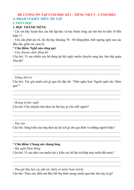 ĐỀ CƯƠNG ÔN TẬP CUỐI HỌC KÌ I – TIẾNG VIỆT 5 – CÁNH DIỀU