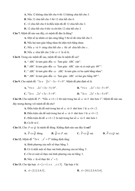 Câu 6. Phát biểu mệnh đề đảo của mệnh đề “Nếu 12 chia hết cho 6 thì 12 chia hết cho 3”.