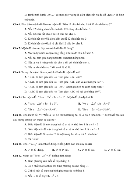 Câu 6. Phát biểu mệnh đề đảo của mệnh đề “Nếu 12 chia hết cho 6 thì 12 chia hết cho 3”.