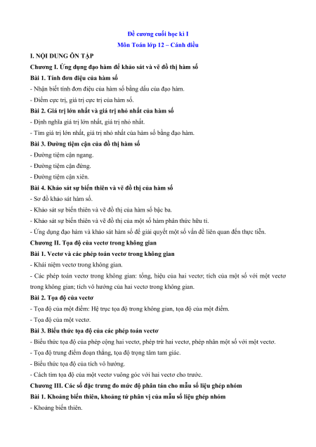 Môn Toán lớp 12 – Cánh diều I. NỘI DUNG ÔN TẬP