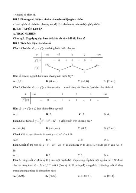 - Định nghĩa và cách tìm phương sai, độ lệch chuẩn của mẫu số liệu ghép nhóm. II. BÀI TẬP ÔN LUYỆN A. TRẮC NGHIỆM