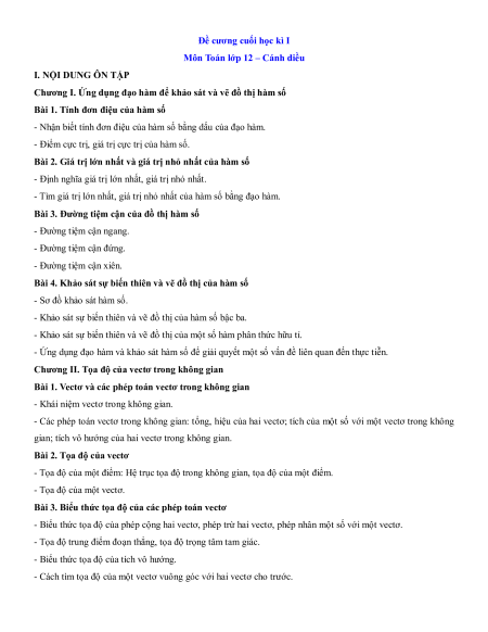 - Tailieugiaovien.com.vn giới thiệu bộ đề cương Cuối kì 1 Toán 12 Cánh diều cấu trúc mới có tự luận mới nhất nhằm giúp Giáo viên có thêm tài liệu tham khảo ra đề thi Toán 12.