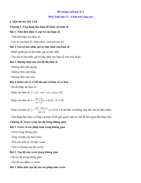 Đề cương ôn tập Cuối kì 1 Toán 12 Chân trời sáng tạo cấu trúc mới (có tự luận)