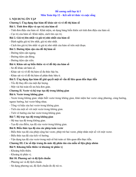Môn Toán lớp 12 – Kết nối tri thức và cuộc sống I. NỘI DUNG ÔN TẬP