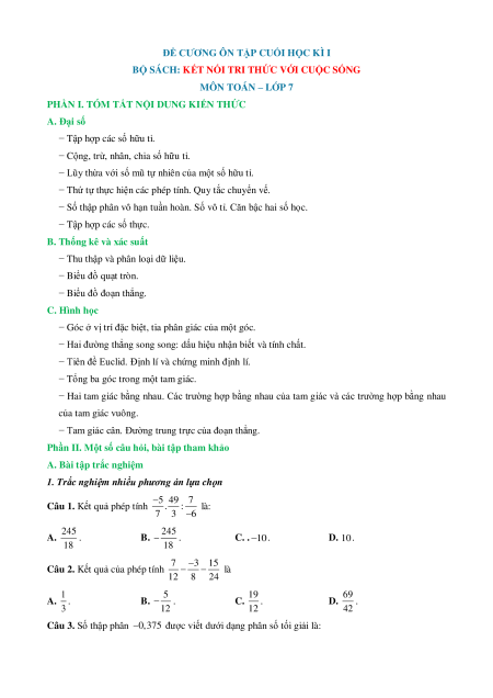 Đề cương ôn tập Cuối kì 1 Toán 7 Kết nối tri thức cấu trúc mới (có đúng sai, trả lời ngắn, tự luận thực tế)