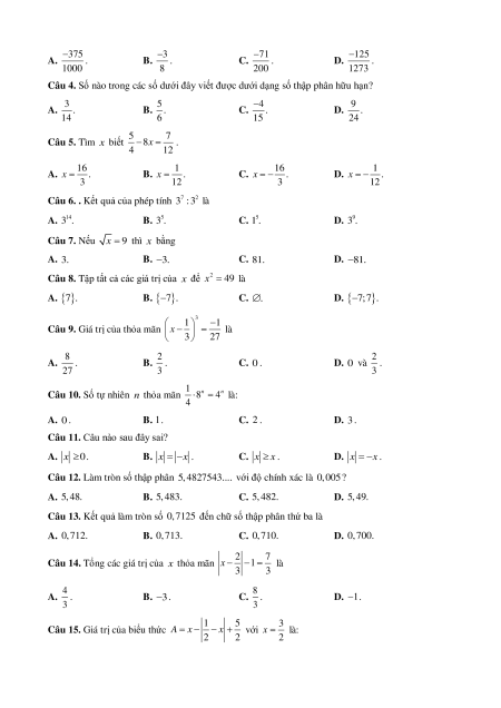 Câu 4. Số nào trong các số dưới đây viết được dưới dạng số thập phân hữu hạn? 3 5 4 9 A. . B. . C. . D. . 14 6 15 24 5 7