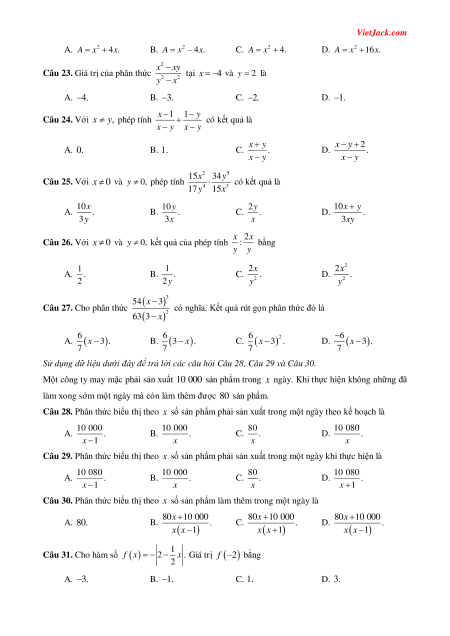 Câu 28. Phân thức biểu thị theo x số sản phẩm phải sản xuất trong một ngày theo kế hoạch là 10 000 10 000 80 10 080 A. . B. . C. . D. . x 1 x x x