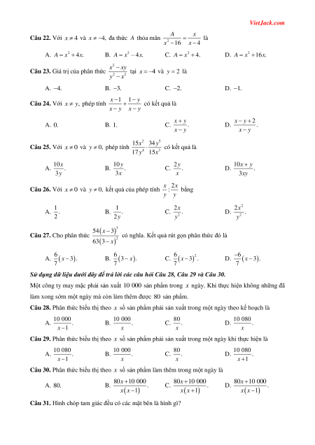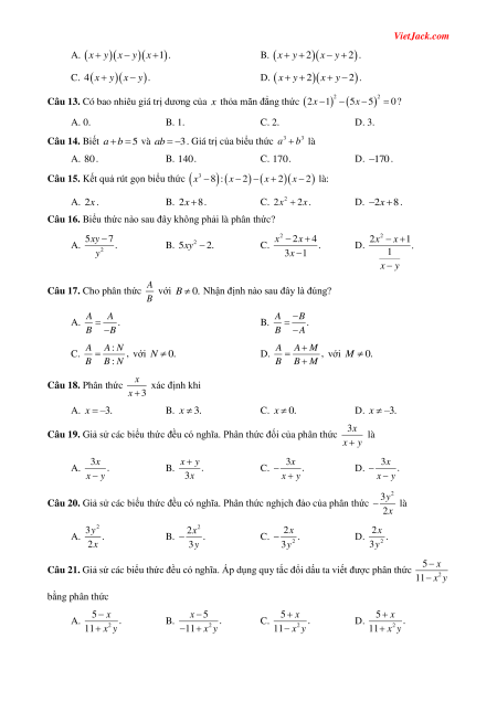 Câu 21. Giả sử các biểu thức đều có nghĩa. Áp dụng quy tắc đổi dấu ta viết được phân thức 2 11 x y bằng phân thức 5 x x 5 5 x 5 x A. . . . . 2 11 B. x y 2 11 C. x y 2 11 D. x y 2 11 x y VietJack.com A x
