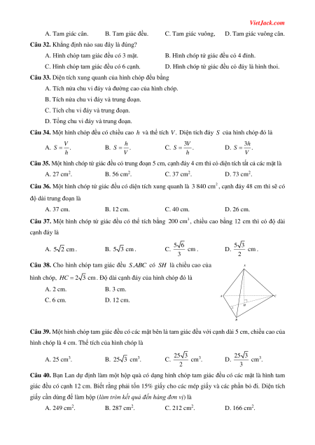 Câu 31. Hình chóp tam giác đều có các mặt bên là hình gì?
