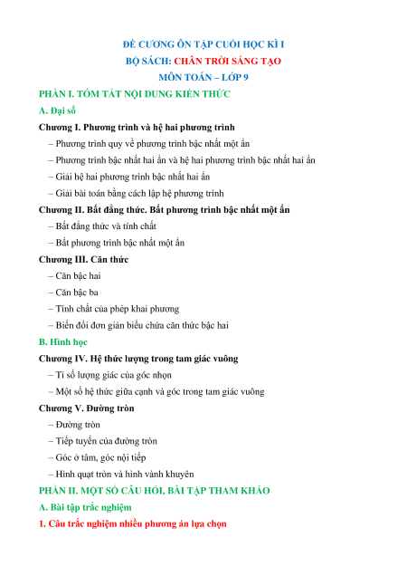 - Tailieugiaovien.com.vn giới thiệu bộ Đề cương ôn tập Toán 9 Cuối kì 1 theo cấu trúc trắc nghiệm mới gồm trắc nghiệm 4 lựa chọn, Đúng / Sai và trả lời ngắn Chân trời sáng tạo mới nhất nhằm giúp Giáo viên có thêm tài liệu tham khảo ra đề thi Toán 9.