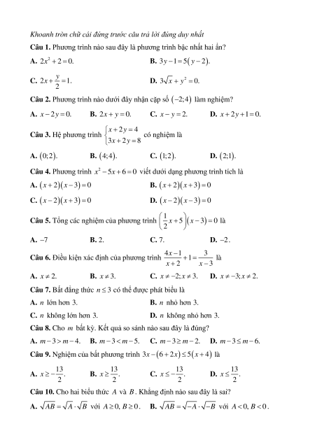 Câu 1. Phương trình nào sau đây là phương trình bậc nhất hai ẩn? A. 2 2x 2 0.