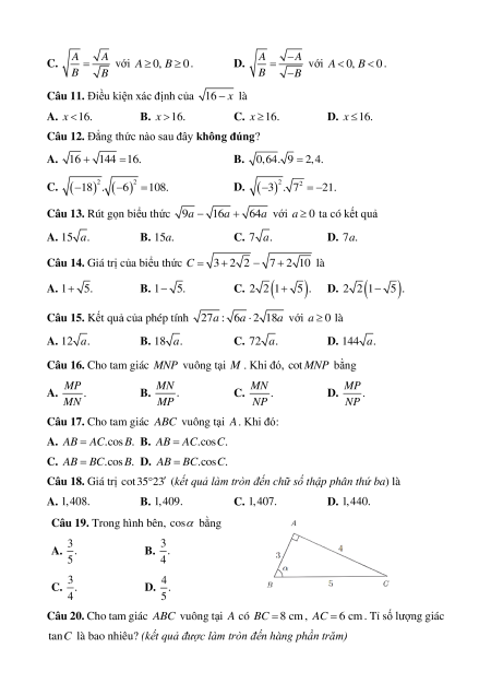 Câu 19. Trong hình bên, cos bằng 3 3 A. . B. . 5 4 3 4 C. . D. . 4 5