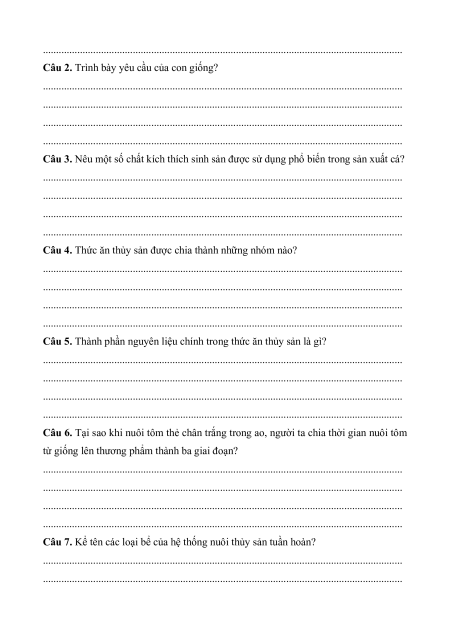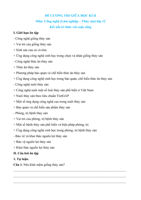 + Khai thác nguồn lợi thủy sản II. Câu hỏi ôn tập 1. Tự luận.